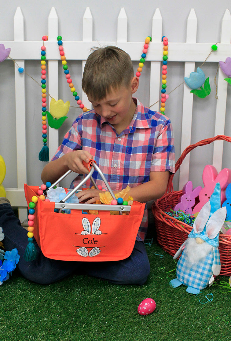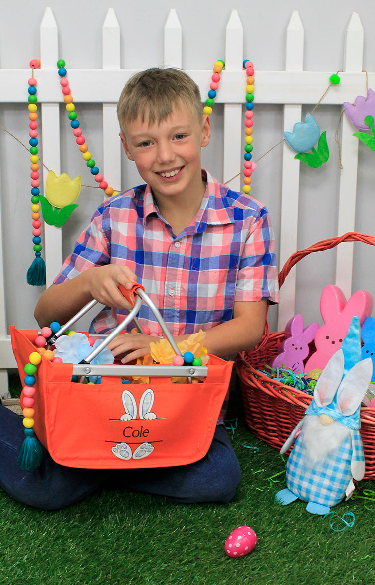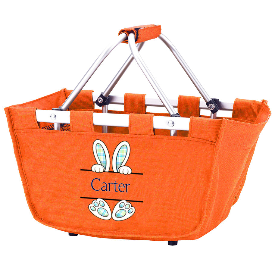 This exclusive Viv&Lou® mini market tote is super cute and very versatile! Use in your car, to tote your child's things to day care, as a gift basket, ideal for that Easter egg hunt and more! The collapsible design is made with a durable aluminum frame. It is super light-weight and a great way to store and transport anything you need! Comes with a colorful holiday graphic and personalized with embroidered name up to 10 characters. Two font styles and colors are determined by best match for the bag color or design.