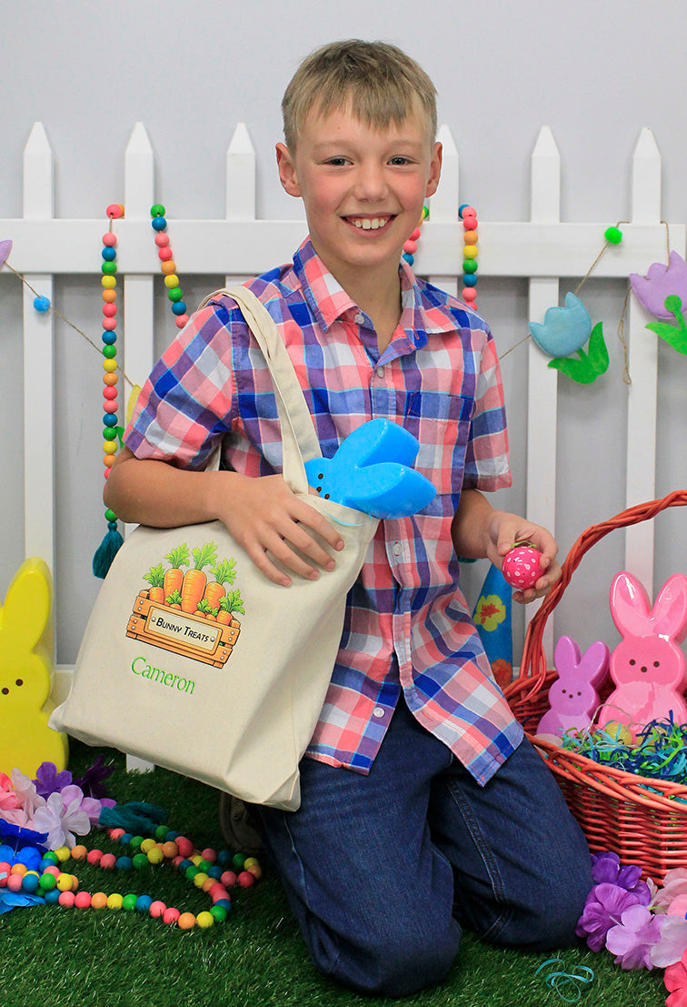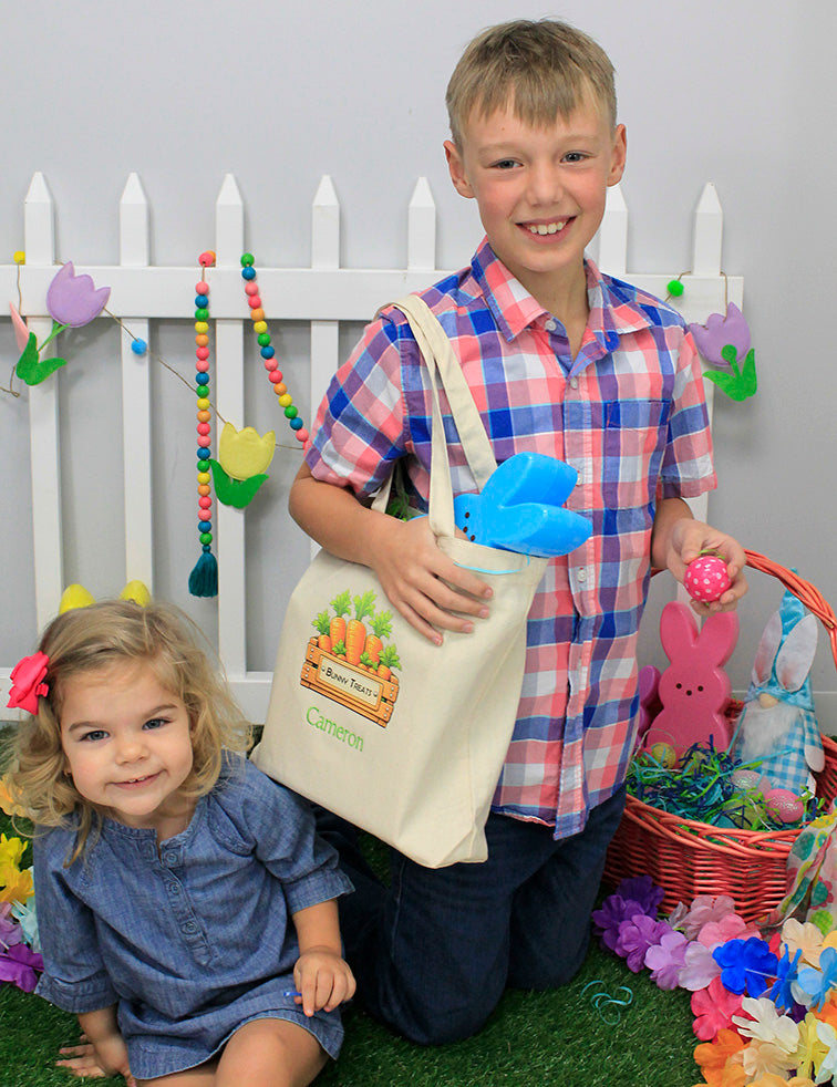 A large canvas Easter tote with exclusive graphics by Viv&Lou®. Perfect for hunting eggs in the backyard, a tote for all your easter gifts, and even a toy tote for year-round! Measures 14" x 13" x 3" and made of heavy cotton material. Comes with a colorful holiday graphic and personalized with embroidered name up to 10 characters. Two font styles and colors are determined by best match for the bag color or design.