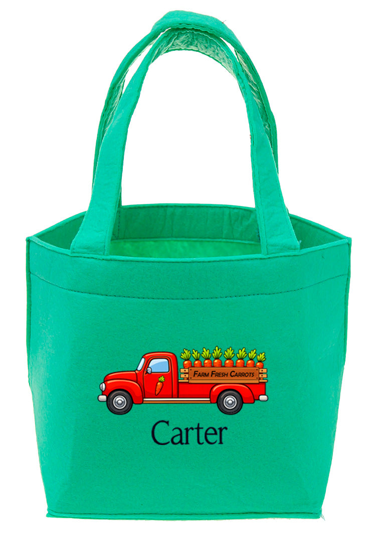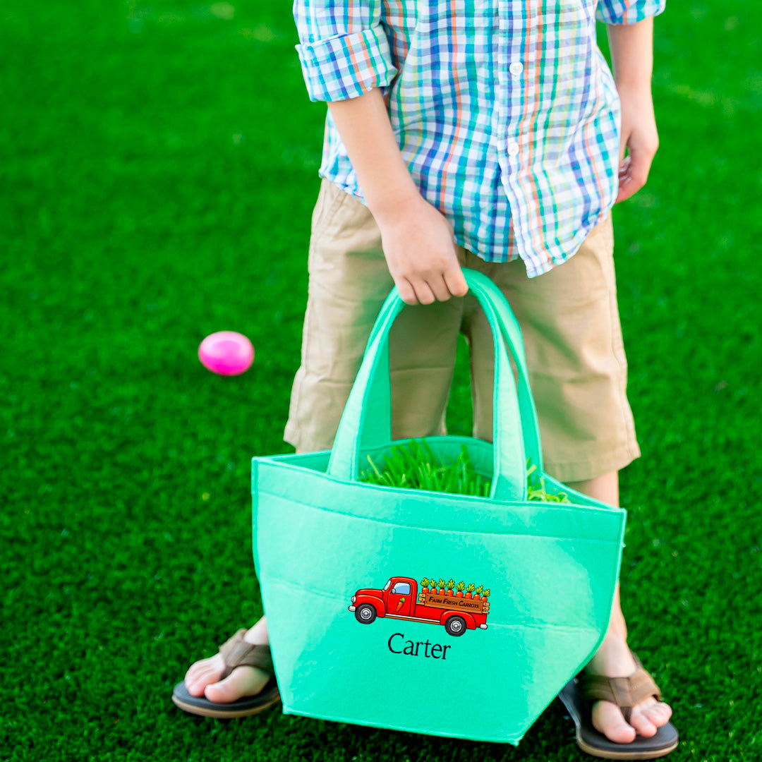 Hop to it, this super soft MINT felt Easter bucket is perfect for hunting eggs in the backyard and for using as a toy tote later-on! 10"L x 8"W x 8"H Thick Felt with a colorful holiday graphic and personalized with embroidered name up to 10 characters. Two font styles and colors are determined by best match for the bag color or design.