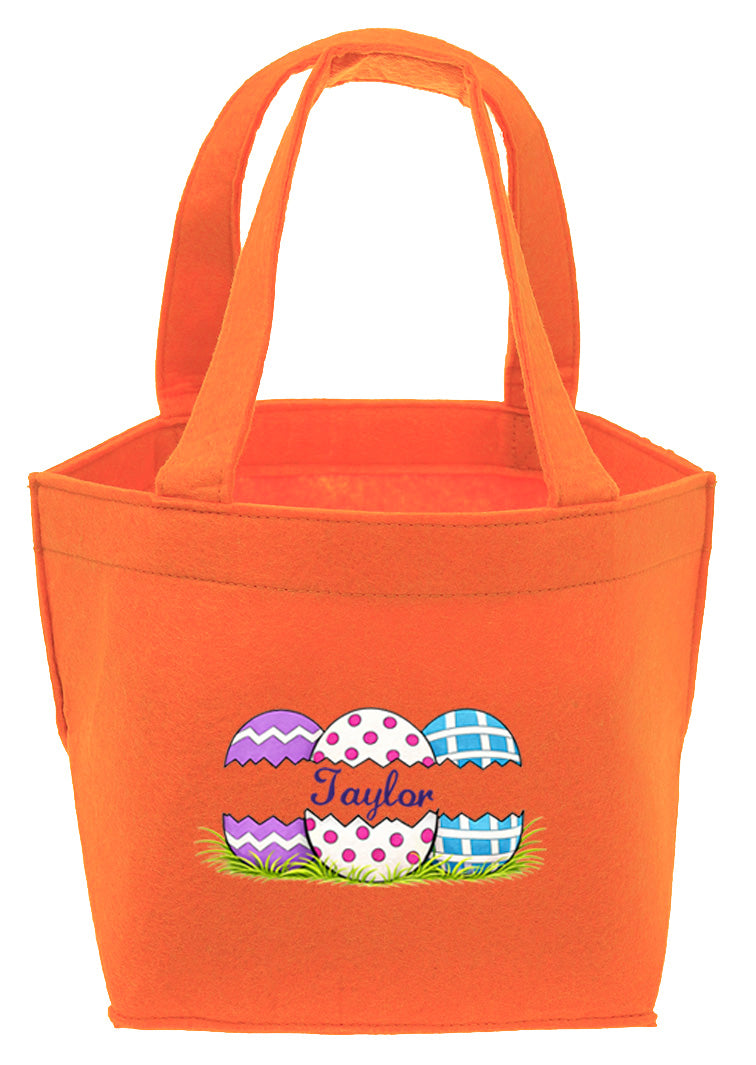 Hop to it, this super soft ORANGE felt Easter bucket is perfect for hunting eggs in the backyard and for using as a toy tote later-on! 10"L x 8"W x 8"H Thick Felt with a colorful holiday graphic and personalized with embroidered name up to 10 characters. Two font styles and colors are determined by best match for the bag color or design.